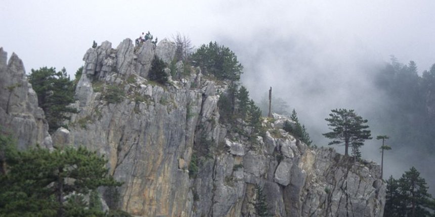 Continue through the large but sparse Bosnian pines for approximately 35-40 minutes until the path reaches an open saddle where it continues towards the south on the flat for a few minutes until Arapi Stream and higher the peak of Skourta (2.485 m). At this point descend for 5-10 minutes along the stream staying as close to the rock and as far left as possible.
